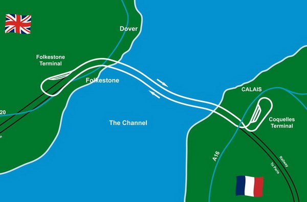 Сообщается между Кале, Франция и Дувром, Англия.